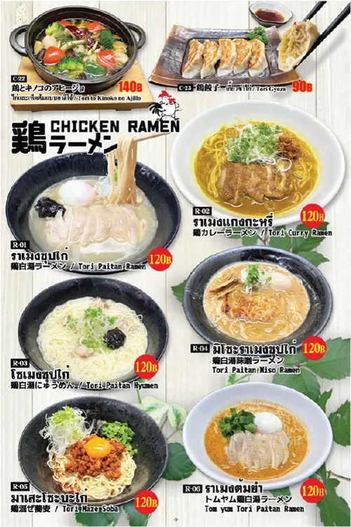 ほかには、飲んだ後の締めにピッタリな鶏白湯ラーメンや鶏カレーラーメン、鶏白湯にゅうめん、鶏白湯味噌ラーメンなど麺類は120バーツ均一となっています。