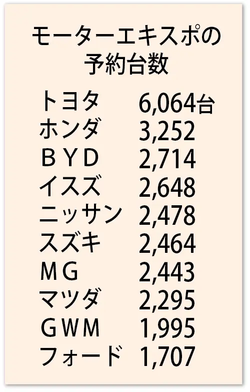 予約で人気トップはトヨタだが、電気自動車(EV)のBYDの躍進が目に付く。現在、中国からの輸入だが、2024年からタイで新工場での生産を計画している。また、タイでの自国生産をうたうCPグループのMGも日本車に着実に食い込んでいる。