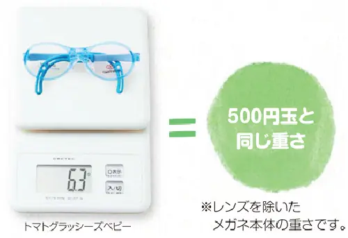 メガネ本体の総重量は非常に軽量で、メガネに慣れていないお子様でも負担になりにくい軽さです。