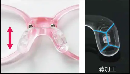 変形があまり生じない特殊な樹脂と、肌にやさしいシリコン製のノーズパッドには滑らずズレにくい溝加工が施されています。
