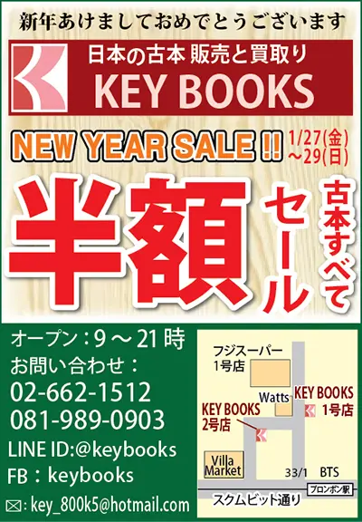 スクムビット・ソイ33/1で2店舗を出店している「キーブックス」では、1月27日から29日の3日間、古本がすべて半額で購入できるニューイヤーセールを開催します。