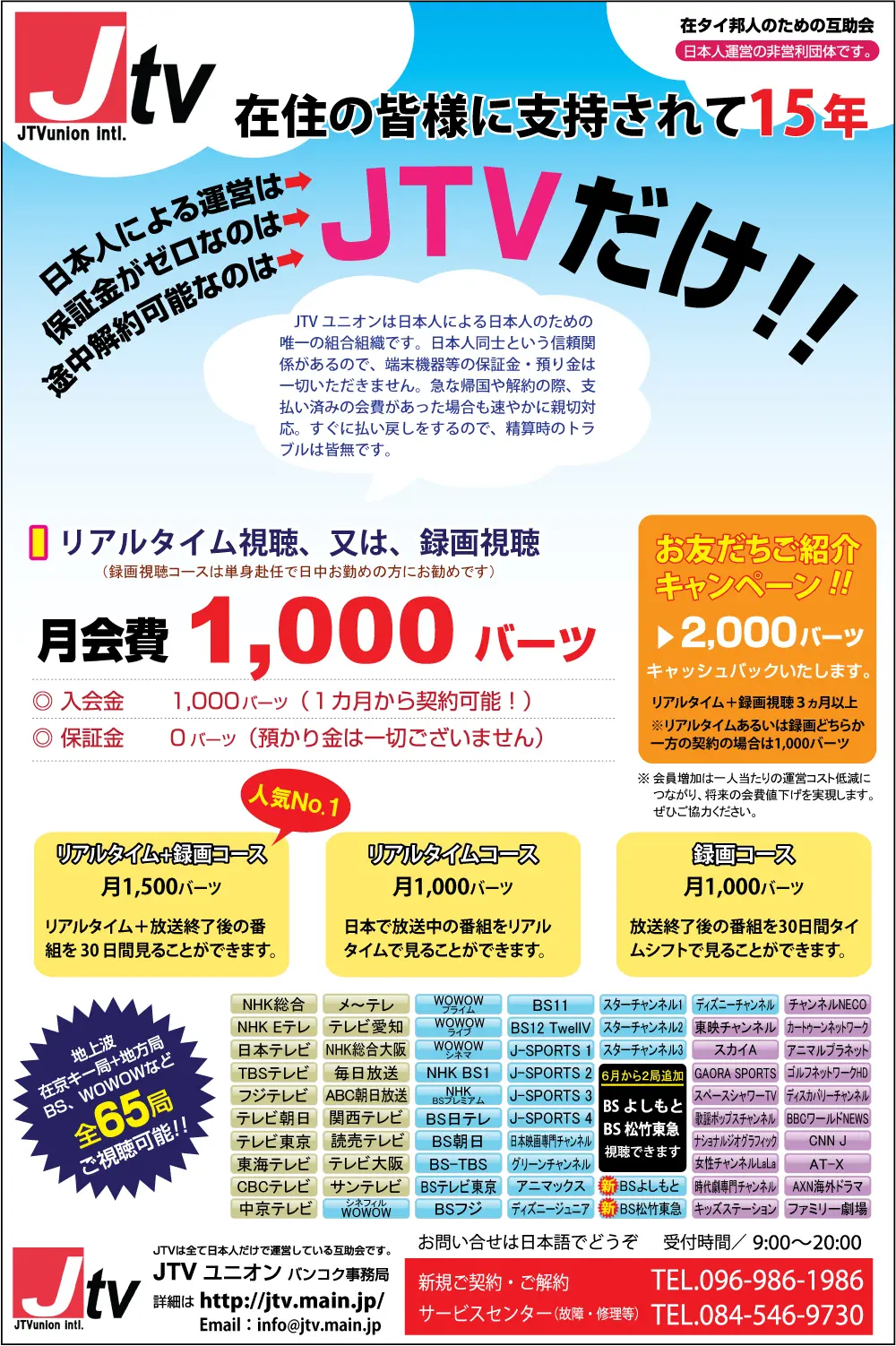 JTVユニオンでは、お友達紹介キャンペーンも実施中です。会員から紹介された人がリアルタイム+録画視聴で3ヵ月以上の契約をされると、紹介者に2,000バーツをキャッシュバック(リアルタイムあるいは録画どちらか一方の契約は1,000バーツ)いたします。