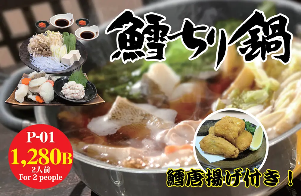 ほかの鍋料理では、鱈ちり鍋が2人前で1,280バーツとなっており、こちらは鱈の唐揚げが付いてきます。