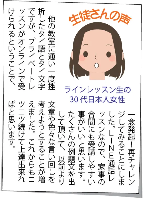 一度はタイ語を勉強しても自分には無理とタイ語を諦めた人も少なくないようです。多くのタイ語学校の先生は日本語が喋れるタイ人ですが、微妙な意味のニュアンスや詳しい文法の説明は難しいようです。またタイ人講師のなかにはタイ語の発音に厳しく、日本人にはどうしても発音できない場合があります。