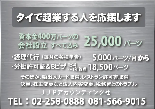 経理代行は、1カ月5,000バーツからですが、日本に本社があってタイにタイ法人の会社をつくっている企業等にも対応するため、経験豊富なタイ人会計士、公認会計士を揃えています。社内に経理担当がいても、不安な場合などは利用してもらいたい。下の広告内の電話まで。