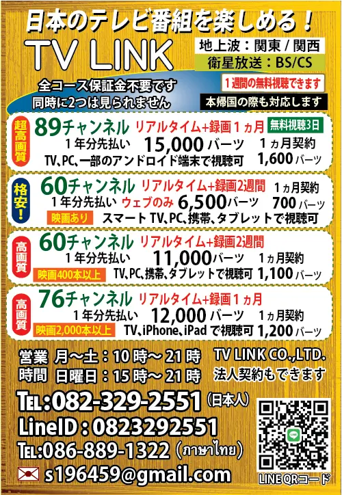 さらに超高画質の89チャンネルコースは1年先払いで15,000バーツとなります。視聴端末については、下記広告を参照して下さい。