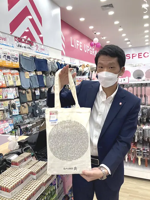 限定トートバッグを持つダイソータイランドの花岡秀行社長
