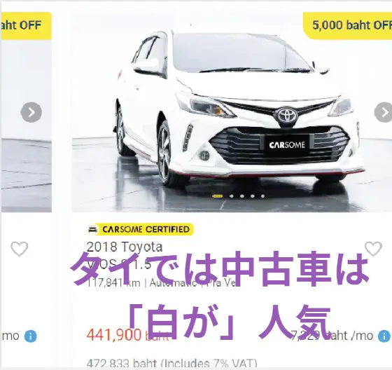 ウェブの中古車販売のプラットフォーム「Carsome」によると、販売の伸びとともに、中古車の色でいうと、36%が「白」の車で、タイ人は白を買う人が多いようだ。実際に、中古車の下取りなどで車を売る場合は、黒やグレイなどよりも5~10万バーツ高く売れる。