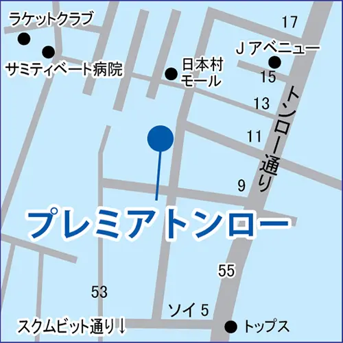 物件の周辺には日系の飲食店も多く、トンローエリアの中心地です。スーパーやコミュニティモール、日本人御用達のサミティベート病院などもあり、日本人に人気の好立地で、早い者勝ちのお薦め物件です。