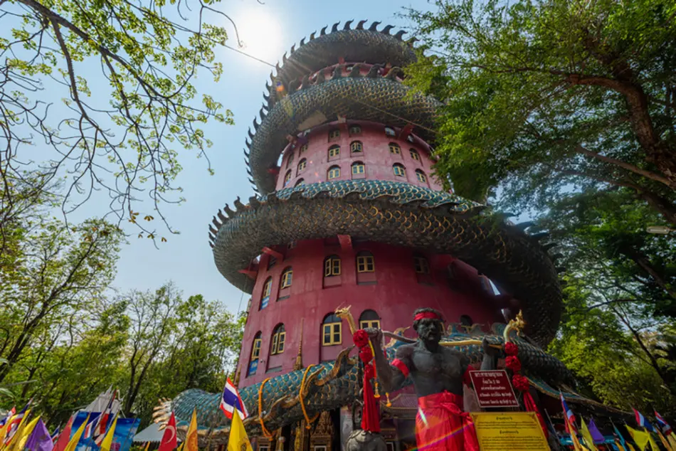 ワット・サンプラーンの塔「ドラゴンタワー」は内部を歩いて登れる。厚手の靴下があると登りやすい