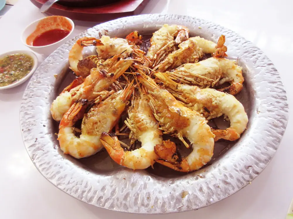 蒸し焼きにされたエビは炎のパフォーマンスだけでなく味の良さも有名