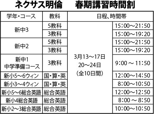 日本人向けの学習塾「ネクサス明倫」では、3月に上記の日程で春期講習会を行います。各学年とも前学年までの復習及び新学年の予習を行います。小学部ウインコースは従来の国語・算数に加え総合英語(ネイティブの先生と日本人による指導)もセットにした総合的な講習会を行います。