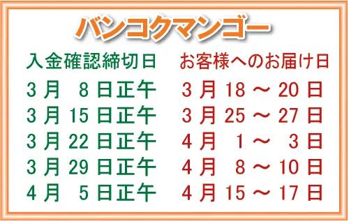 バンコクで毎週水曜日の正午までに注文をすれば、翌週の土曜日から月曜日に日本の指定場所にお届けいたします。申込み締め切り日と配達日は上の表を参照してください