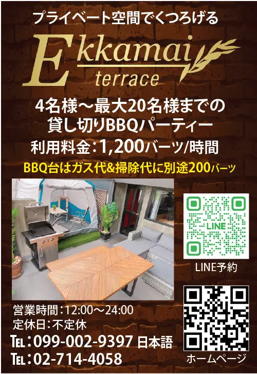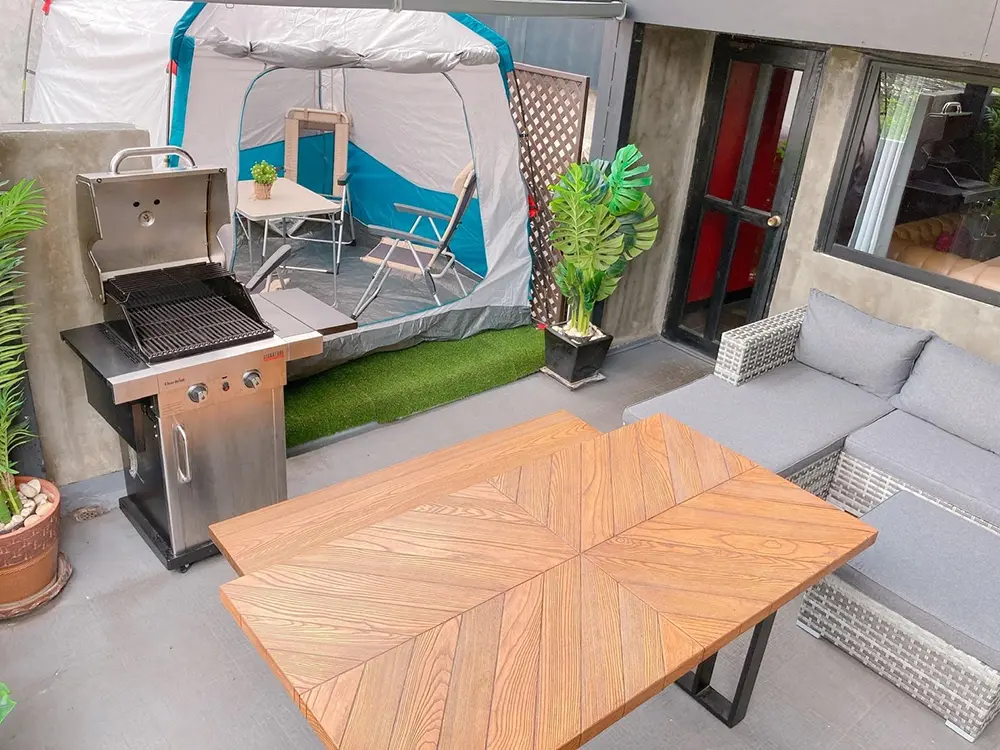 完全貸切りのバーベキューテラスで、好きな食材や飲み物を持ち込んで、プライベートなパーティーが楽しめます。利用料金は1時間1,200バーツで、テラスやテント、室内のVIPスペースもすべて貸切りで利用できます。