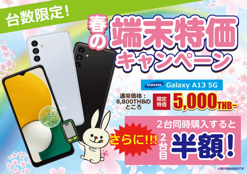 ベリーモバイルにて取り扱い中の「サムスン ギャラクシーA13 5G」が通常販売価格8,800バーツ(税別)のところ、限定価格の5,000バーツ(税別)で購入することができます。さらに、同端末を2台同時購入された場合は、2台目の価格がさらに半額の2,500バーツ(税別)で購入できます。
