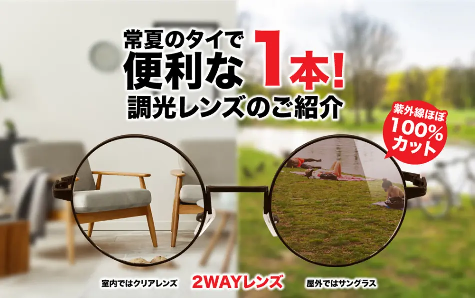 調光レンズとは室内ではメガネ、屋外ではサングラスになる2WAYレンズです。