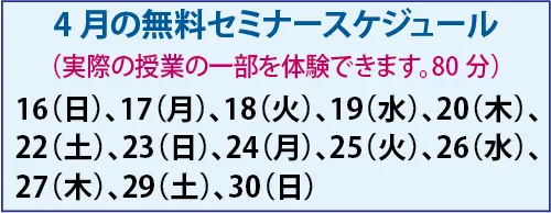 定期的に開催される無料セミナー(80分)では実際の授業の一部を体験できますので、ぜひ一度日本語の面白さに触れてみて下さい。途中で本帰国になった場合も、日本国内継続受講制度があるので安心です。