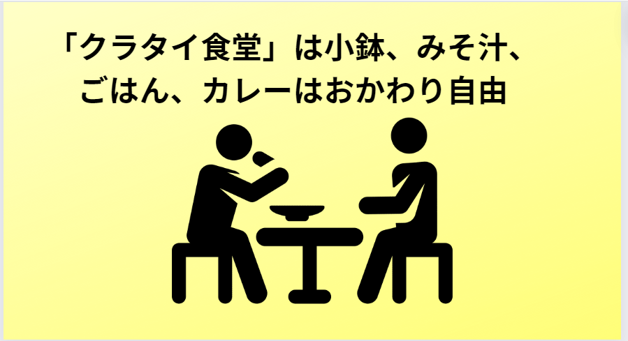 小鉢やごはん、生卵(TKG)、味噌汁、カレーが食べ放題なのが「クラタイ食堂」。
