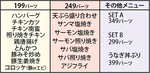 メインのおかずは199バーツからあり、魚のメニューと天ぷら盛合せは249バーツ、ほかにおかずがてんこ盛りのセットAが349バーツ、セットBが299バーツ、うなぎ丼ぶりは399バーツでいただけます。