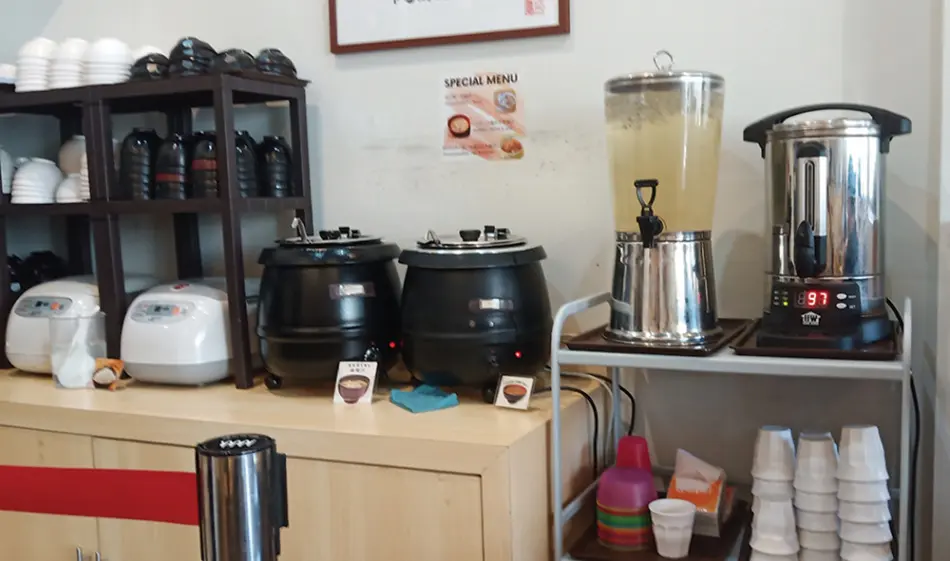 オーダーが済むとトレーを渡してくれるので、総菜コーナーで好きな小鉢やサラダ、箸、スプーンなどの食器を取っていきます。次にごはんとみそ汁のコーナーがあり、ここにはカレーも常備されています。日本の家庭のままのカレーです。冷たいお茶と熱いお茶も用意されているので、好きな方を選んで持っていきましょう。