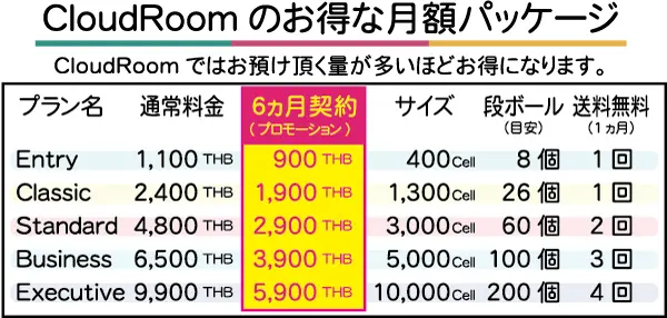 クラウドルームのボックスストレージは、先に段ボール箱の必要数を送料無料でお届けします。クラウドルーム公式段ボールは1箱50セルで、1箱からお預けいただけます。料金は、1箱だけ預ける場合には月額150バーツ、エントリープランなら月額900バーツで8箱預けられます。