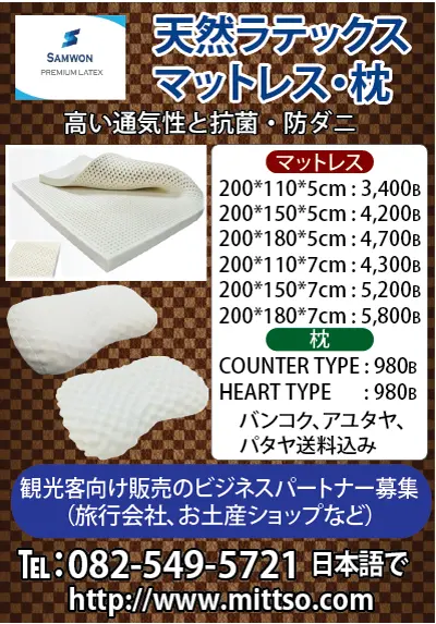 タイ産天然ラテックス100%のマットレスと高反発枕を一貫生産している「サムウォンラムルッカ・タイランド」では、原産国ならではの低価格で寝具を販売しています。