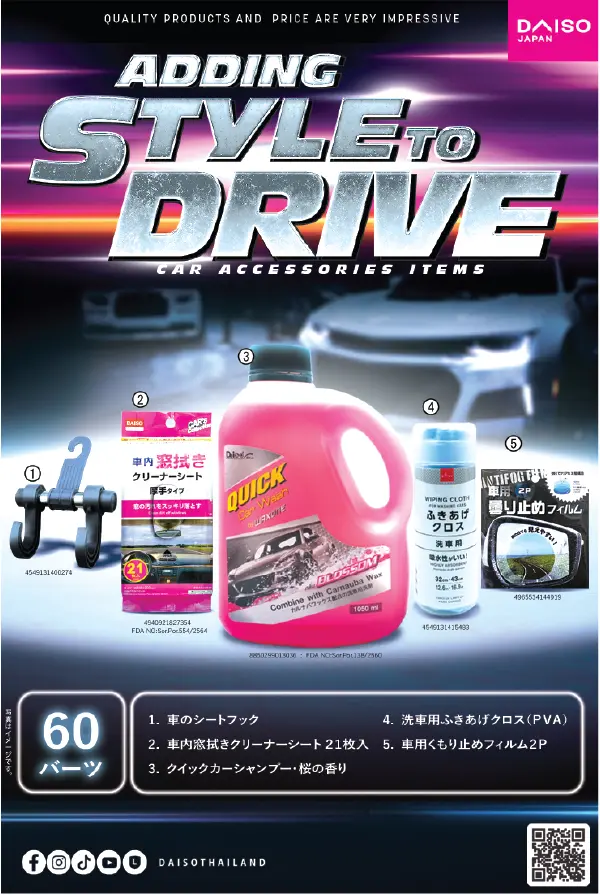 たとえば、カーアクセサリーコーナーでは、洗車用のカーシャンプーが1050ml大容量で60バーツ!カルナバワックス配合の洗剤で、洗って拭くだけの簡単な製品です。