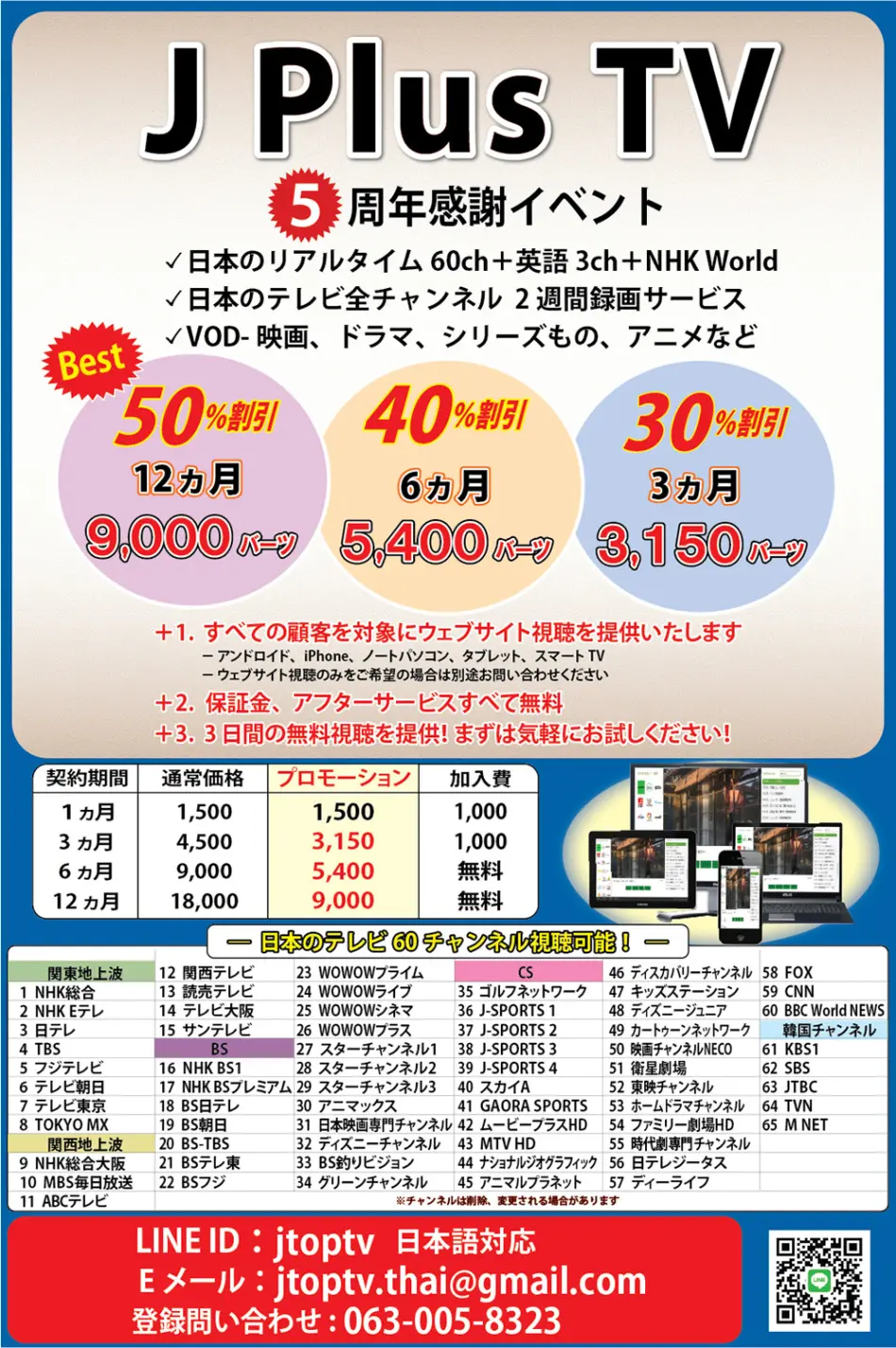 感謝イベントでは、3ヵ月契約で通常4,500バーツのところ、30%引きの3,150バーツ、6ヵ月契約は通常9,000バーツのところ、40%引きの5,400バーツ、1年契約なら通常18,000バーツのところ、なんと50%引きの9,000バーツとなっています。先着100名限定の特別料金です。新規契約でも、現在JプラスTVを利用中の人も対象です。