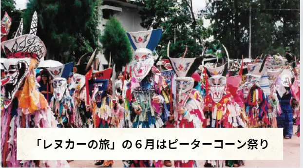 ピーターコーン祭りは23日の午前3時のウパクット招聘から始まり、23日から24日の午後チャオ・ポー・クワンがロケットの山車に乗り、村人たちに担がれてポーンチャイ寺本堂に入るまで続きます。祭りの2日間は奇妙滑稽な姿で踊りまくり、村人たちをからかったお化けピーターコーンのチャオ・ポーが本堂に入り、お化けの仮面が川に流されると一斉に退きます。ロケットが空に打ち上げられ、夕べには本堂で説経が始まり、翌日の夕べまで1日で13巻のヴェッサンドーン王子物語が読み上げられます。「レヌカーの旅」では、毎年ピーターコーン祭りを2つの旅として紹介しています。