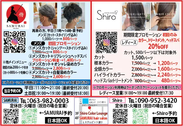 ヘアカラーやヘッドスパを専門としているヘアサロン「Shiro Color Lounge」では、特別セットメニューを実施中です。カットと1ステップトリートメントが通常2,100バーツのところ1,700バーツ。カットと根元カラーが通常3,000バーツのところ2,500バーツとお得なメニューです。