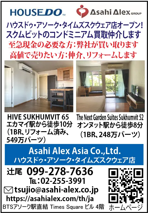 住宅建設やオフィス・店舗の内装を手掛けている「アサヒアレックスアジア(新潟本社、東京、埼玉、仙台、福岡に支店)」が、日本の不動産会社ハウスドゥ(東証一部上場、日本国内に700店のネットクークを持つ)のフランチャイズ1号店として、バンコクで不動産事業を始めました。