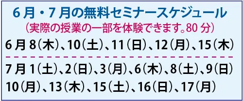 定期的に開催される無料セミナー(80分)では実際の授業の一部を体験できますので、ぜひ一度日本語の面白さに触れてみて下さい。途中で本帰国になった場合も、日本国内継続受講制度があるので安心です。