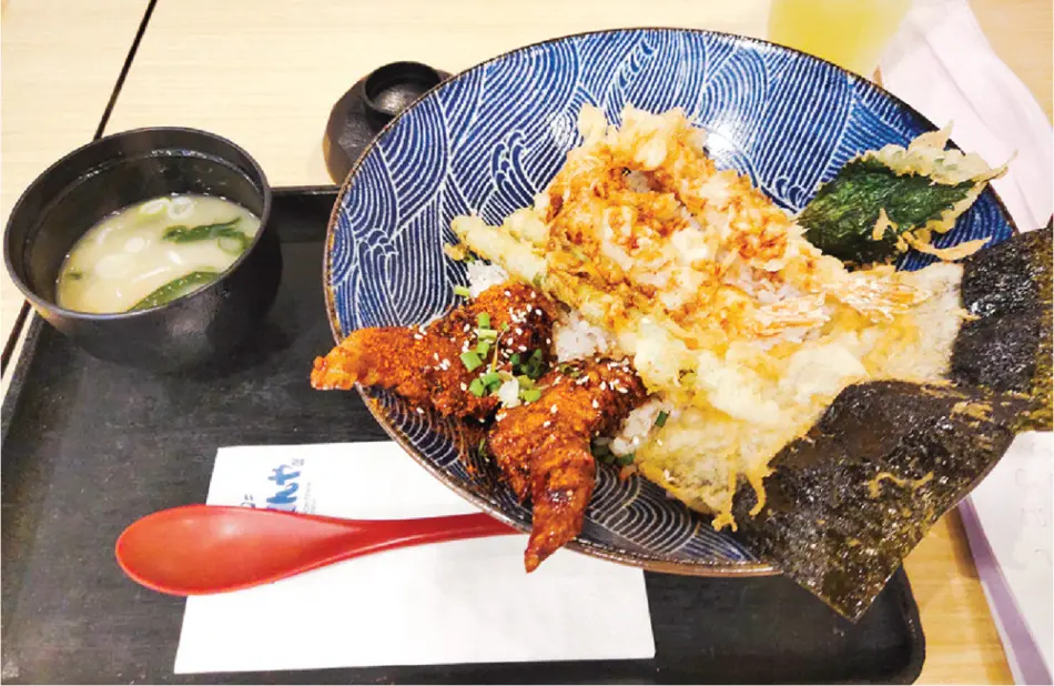 さて、ダイソーをひと通り見たのち、昼間なので食事場所を探します。「天丼てんや」に入ると、結構タイの若い人で混んでいて、ランチ場所として定着しているようです。セットだとえび天2本などが入った天丼+ドリンクで179バーツ+39バーツ。大きめのえびは満足ですがあと、パリパリののり2つはちょっと不思議な天ぷらで、あと手羽先も2つ入っていて、それを見ると、邪道だなとは思いましたが、食べてみると ちょっと甘辛くておいしい。大きなお椀もボリューム感があり、なかなかよい。