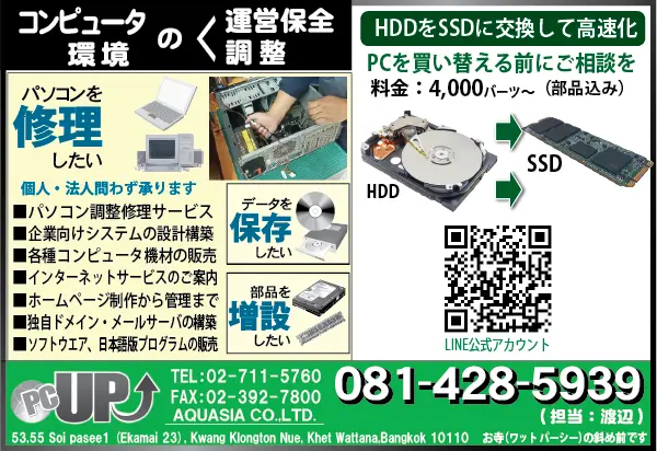 (3) PC-UPではパソコンの不具合は年中無休で対応! | タイ バンコク タイ自由ランド. https://jiyuland5.com/%e3%83%91%e3%82%bd%e3%82%b3%e3%83%b3%e3%81%ae%e4%b8%8d%e5%85%b7%e5%90%88%e5%b9%b4%e4%b8%ad%e7%84%a1%e4%bc%91%e3%81%a7%e5%af%be%e5%bf%9c%ef%bc%81/.