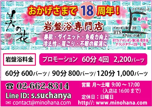 「美の花」という岩盤浴専門店があるようです。タイのバンコクで25年間、フリーペーパーを発行している「タイ自由ランド」が、冷え性改善や免疫力の向上に効果があることで知られている岩盤浴専門店「美の花」を紹介しています。¹ 施設案内によると、岩盤浴の1回分は700Bからとなっています。²¹: [タイ自由ランド](https://www.jiyuland4.com/%E7%BE%8E%E3%81%AE%E8%8A%B1/)