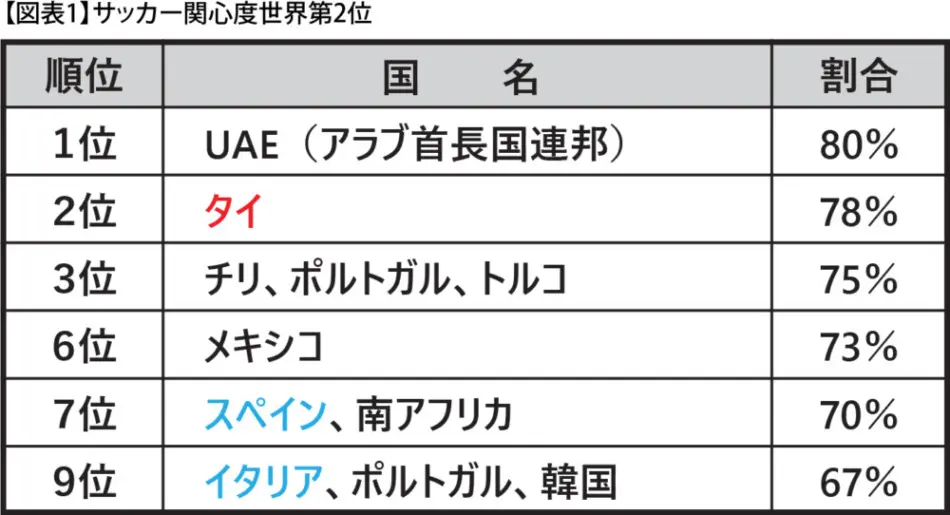 タイで盛り上がるスポーツといえばサッカーだ。プレーする人も多ければ観戦する人も多い。タイ男子サッカーはワールドカップに出場したことはないが、サッカーへの関心度は非常に高い。日本でいう「Jリーグ」(男子)がタイリーグとなる。1部リーグ(旧プレミアリーグ)から4部リーグ(アマチュア)まである。米国ニールセン調査によると、サッカーに「非常に関心がある」または「関心がある」人が占める割合は、タイは78%と何と世界2番目の高さだ。総人口から人数に換算すると、約4,000万人が関心を有していることになる。1位UAE、3位以下はチリ、ポルトガル、トルコ、メキシコ、スペインと続く(図表1)。