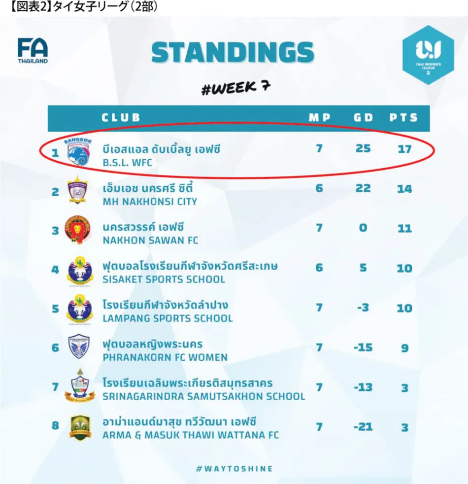 タイの女子代表は、男子代表と違い2015年と2019年の2度にわたってワールドカップに出場している。女子代表を支えるのが2009年に設立されたタイ女子リーグで1部リーグと2部リーグがある。これまで、女子リーグは、各県地域のスポーツ学校等が中心であったが、最近新たな動きとして、西欧のコーチ陣を中心にしたクラブチームに注目が注がれている。その一つがBSL WFC(Women’s Football Club)である。昨年は2部リーグで最下位であったが、今期は突然トップに登場した(図表2)。