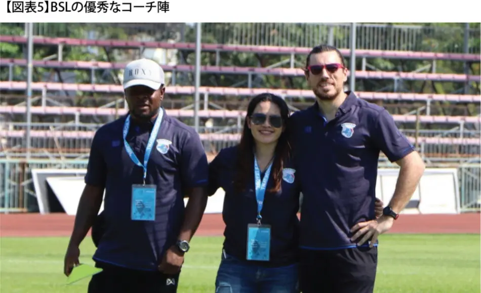BSL WFCは、タイ、イタリア、フランス、イスラエル、米国、豪州、日本など国際色豊かなメンバー構成。今期からは、2015年、2019年女子ワールドカップ出場のタイ代表(注01)のエース級選手もBSL WFCに所属した(図表3)。さらに、ナコンサワン、チョンブリー出身のタイ代表経験者も加わり、その数は16人とBSL WFCレギュラー数を超える(図表4)。さらに、コーチ陣も充実、ナイジェリア・リーグチャンピオン経験のジェームズ、英国からはサムエル、ヘッドコーチにはタイ代表歴10年、コーチ歴22年のソムなど、素晴らしいコーチ陣指導のもと、人材もさらに集まっている(図表5)。