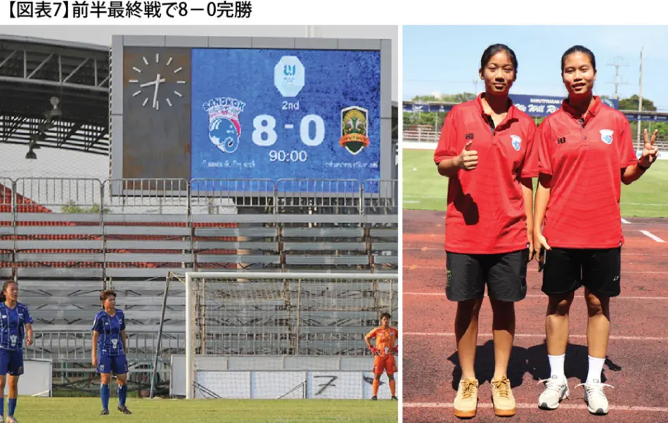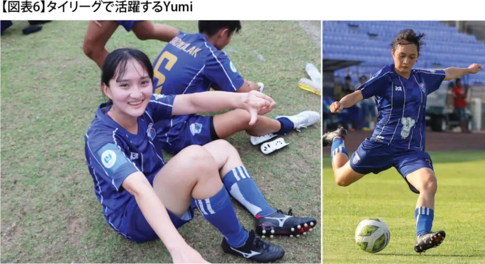 特に注目すべきは、中学まで日本の杉並FCでサッカーをしていたYumiが期待できる(図表6)。元タイ代表選手が多くいるBSL WFCで、代表経験はないがレギュラーとして活躍している。彼女の持ち味は、東京オリンピック強化選手にも選ばれたスピードと持久力だ。小学校6年生の時には、東京都杉並区で100m女子13.8秒の新記録を出し、現在も破られていない。中学では西東京100mで優勝している。タイの国体でも100mで全国8位に入っており、タイサッカー界ではトップクラスの俊足であろう。