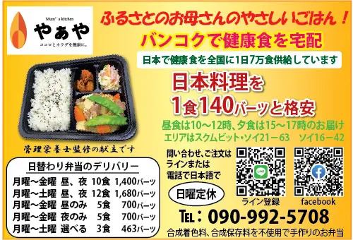 「やぁや」は、健康弁当の宅配サービスを提供している会社です。40年以上の歴史があり、レシピには栄養バランスに配慮したものが多く含まれています。また、クーラーバックで配達してくれるため、食材の鮮度を保っています³。ただし、タイでのサービス提供については確認できませんでした。¹
