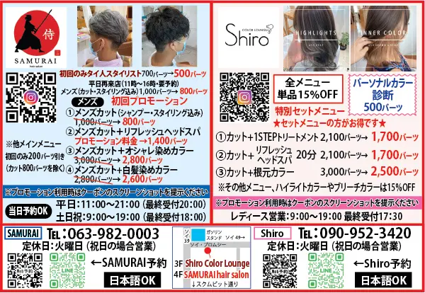 一方、ヘアカラーやヘッドスパを専門としているヘアサロン「Shiro Color Lounge」では、特別セットメニューを実施中。カットと1ステップトリートメントが通常2,100バーツが1,700バーツ。カットと根元カラーが通常3,000バーツが2,500バーツです。カット+カラー(パーソナルカラー診断500バーツ込み)が通常500バーツが4,000バーツとお得になっています。ほかにもお得なメニューがあるので詳しくはお問い合わせを。