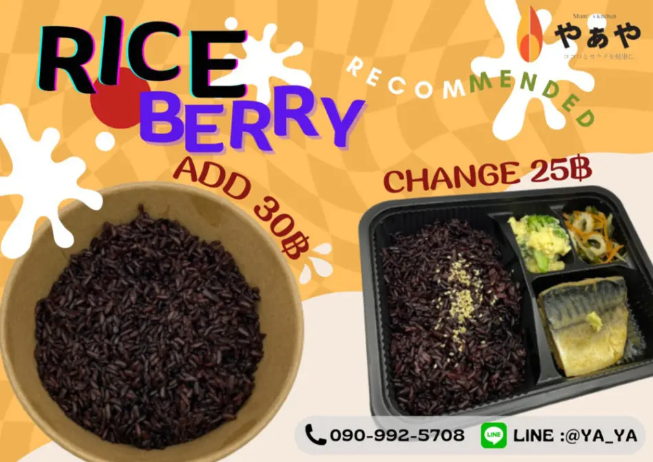 日本語のタイ版ホームページも開設して、さらにご飯をライスベリーに変更できるようになりました。お弁当の白米をライスベリーに変更する場合は+25バーツ、通常のお弁当にライスベリーを追加するなら+30バーツとなります。