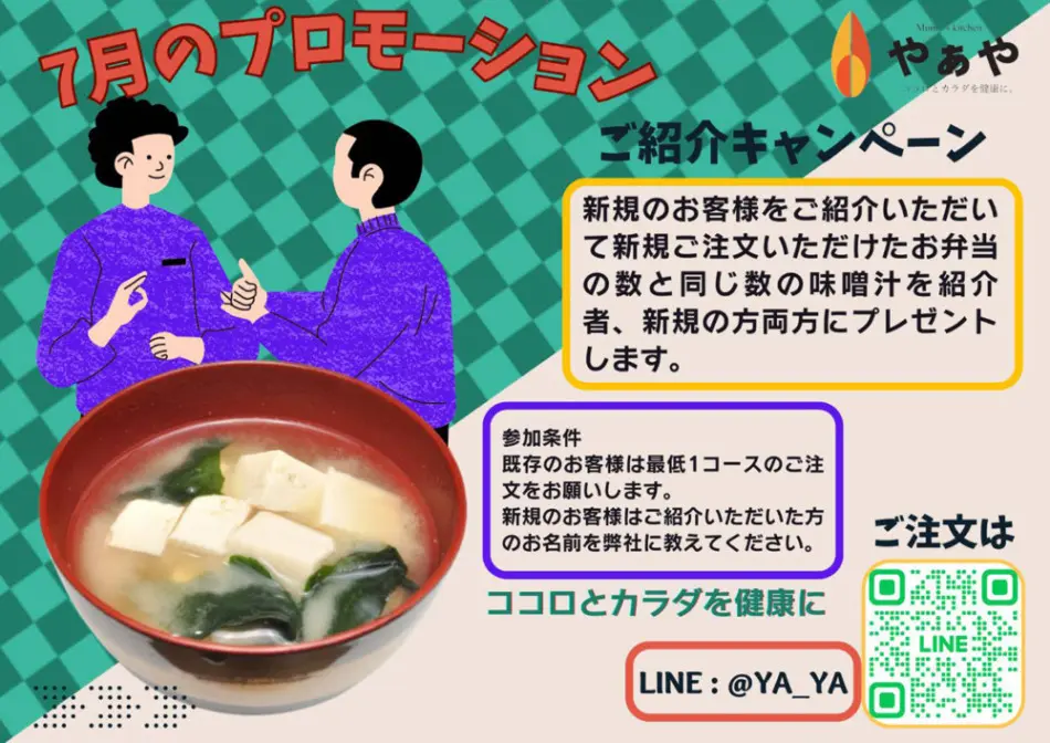 また、7月はプロモーションとして、友達紹介キャンペーンを実施しています。内容は「やぁや」を利用したことがない人を紹介して、紹介された人が注文すると、オーダーされたお弁当の数と同じ数の味噌汁を紹介者、新規客の両方にプレゼント。