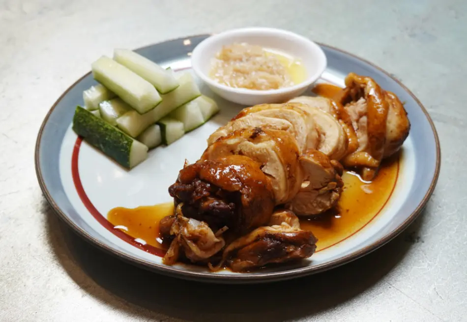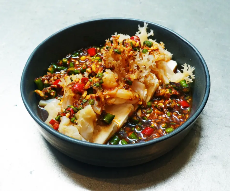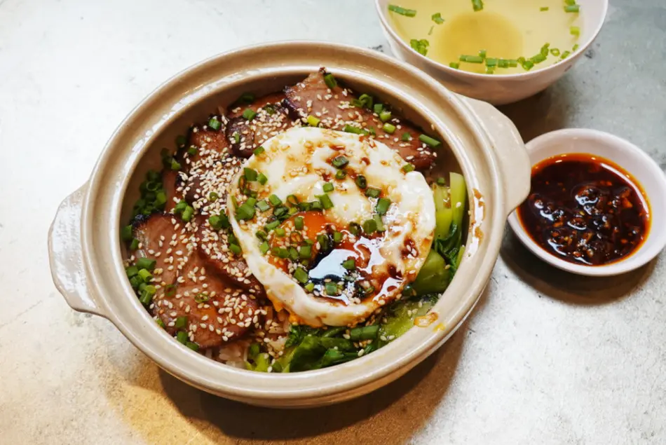 例えば、同店でおすすめの1つである「香港スタイルの豚の炙り焼き丼」(190バーツ)は、お米の上に炙った豚肉と、目玉焼き、小松菜をのせ、甘いタレをかけたものです。炙った豚肉は、ちょうどよい厚さでスライスされているので、食べやすいです。甘いタレがかかっていますが、ピリ辛のタレがついてくるので、そのタレと一緒に食べると旨味が増します。ラー油に似ていて食べやすく、はじめは辛さを感じませんが後から辛みが追いかけてきます。どんどん食べていくと体が熱くなり汗が出てきます。また、「豆腐とクラゲのピリ辛ダレ」(220バーツ)は、絹ごし豆腐にクラゲをたくさんのせ、その上からピリ辛ダレをたっぷりかけたものです。日本ではあまり食べる機会が少ないクラゲですが、コリコリしていて食べやすく、ピリ辛ダレとの相性が抜群です。