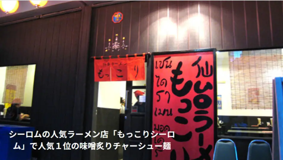 バンコクのシーロムエリアにある「もっこりシーロム」は、仙台ラーメンのお店です。創業10年を迎える老舗ラーメン店で、おすすめの炙りチャーシューメン(218B)があります。¹³