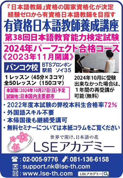 (3) 日本語教師資格取得のためのLSEアカデミー – タイ バンコク タイ自由ランド. https://www.jiyuland4.com/lse%E3%82%A2%E3%82%AB%E3%83%87%E3%83%9F%E3%83%BC/.