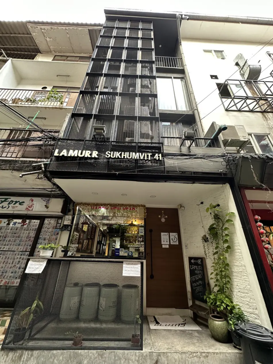 さて今回、編集部の女性Jは、プロンポン駅近で泊まれるホステルに宿泊してみました。ホステルはホテルと違い、よりリーズナブルで宿泊でき、他の宿泊者と交流ができる共用スペースがあるのが特徴。バンコクには多くのホステルがありますが、今回宿泊したホステルは、BTSスクムビット駅から徒歩約6分のところにある「ラムールスクムビット41(Lamurr Sukhumvit 41)」。ソイ41の雑居ビルが建ち並ぶところにあり、現在タイで増加している長屋風で4階建ての建物です。