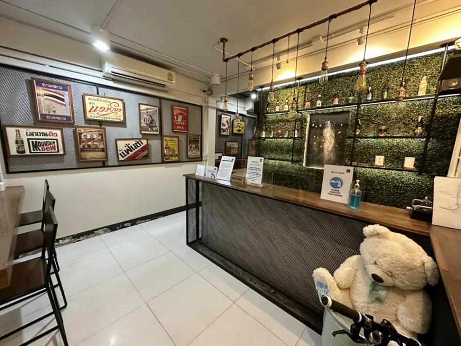 外見は少し古そうなので、てっきり中も古いのかと思っていましたが、リノベーションされていてお洒落で綺麗でした。1階の受付カウンターがあるフロアには、アメリカンビンテージの絵などが飾られていたり、涼しく快適でした。受付カウンターがあるフロアの奥に行くと、テーブルやテレビなどがある共用スペースがありました。すでにそこには、パソコン作業をしている欧米人がいました。実際に写真を撮っていると、あいさつをしてくれたり、声をかけてくれたりと、ホステルに宿泊する楽しさを味わえました。共用スペースの隣には、キッチンがあり、このホステルでは、朝食などは提供されていないので、自分でご飯を買う必要はありますが、電子レンジや飲み水、調味料などの必要最低限のものは揃っているので安心。キッチンを通りすぎると、1回100バーツで洗濯ができる洗濯機と、寝る部屋に行く階段があります。