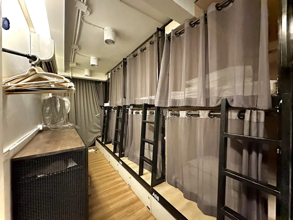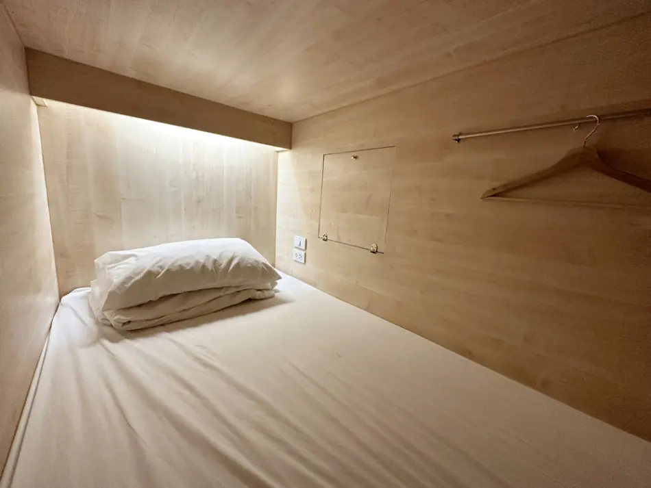 部屋はコンパクトで、2段ベッドと鍵付きのロッカー、ハンガーラックなどがあり、ベッドや枕、かけ毛布は清潔でしっかりとしたものだったので、思っていた以上に寝やすかったです。身長が160cmぐらいの人が寝るにはちょうど良いですが、それより身長が高い人は少し窮屈そうです。枕やかけ毛布以外にも、壁に収納できる机やコンセントなどがあり、座っても天井に頭が付かず丁度よい明かりもあるので作業もでき、ビジネスで宿泊するにも最適。部屋にはもう1人いましたが、すごく静かだったので案外静かな場所だと思いましたが、上の階からの話し声がわりと大きく聞こえたので、男女兼用部屋はもう少し賑やかなのだと思いました。