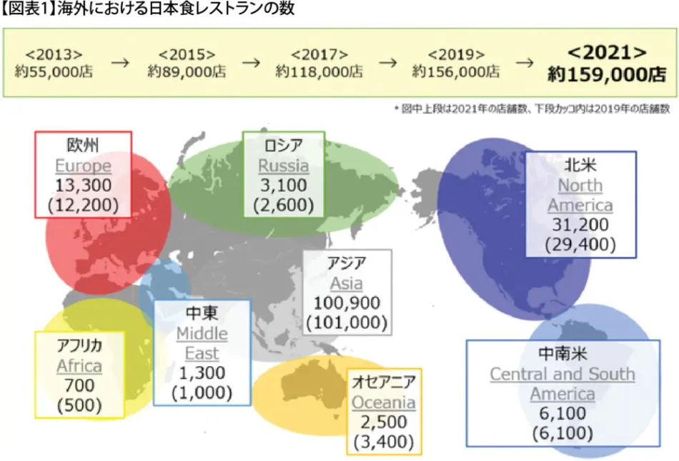 海外の日本食レストラン15.9万店に 海外の日本食レストランは、2017年11万店、2019年には15万店を突破し、2021年7月時点で約15.9万店となった(図表1)。コロナの影響により、2019年から2021年の出店数は微増にとどまっているが、2006年からの15年間で6.6倍に増えている。アジア圏がトップで、10万店舗以上となっている。これは、日本から近く比較的出店しやすいというのが一番の理由であろう。元来日本食は「低カロリーでヘルシーな料理」として海外で好まれていたが、2013年にユネスコの無形文化遺産に登録されたことがきっかけで一気に世界的認知度が高まり、出店数の増加につながったと考えられる。